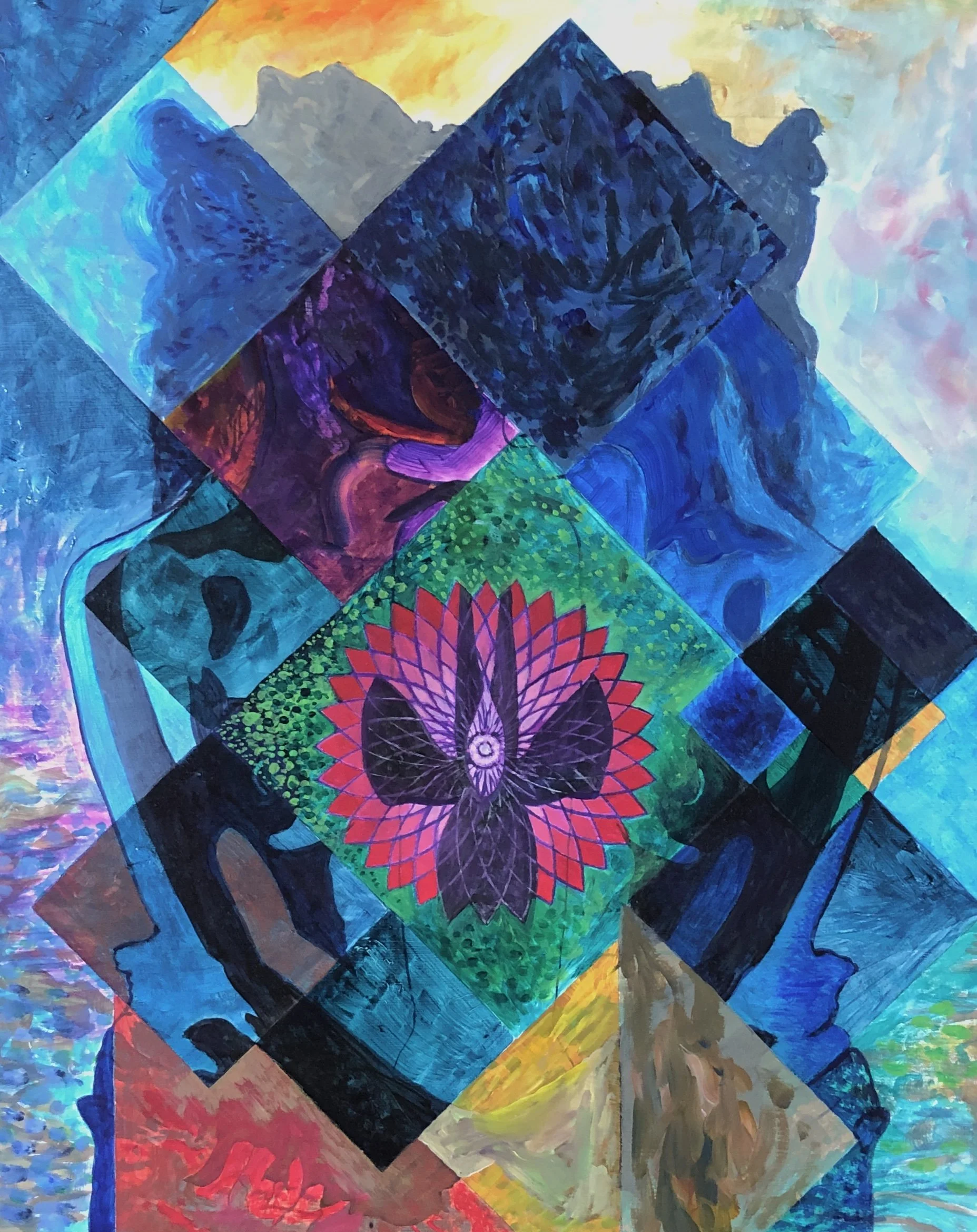 The imagery derives from quilt patterns, references to cubism, abstracted shapes in the art and architecture from my visits to Thai temples, and from looking at medieval mystic illustrations. The use of symbolic visual language is intended to open up the mysterious and the underlying fabric of spiritual being.